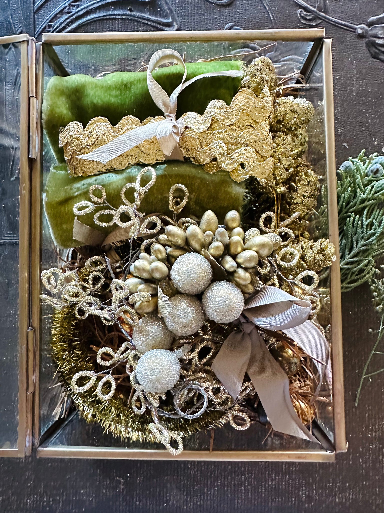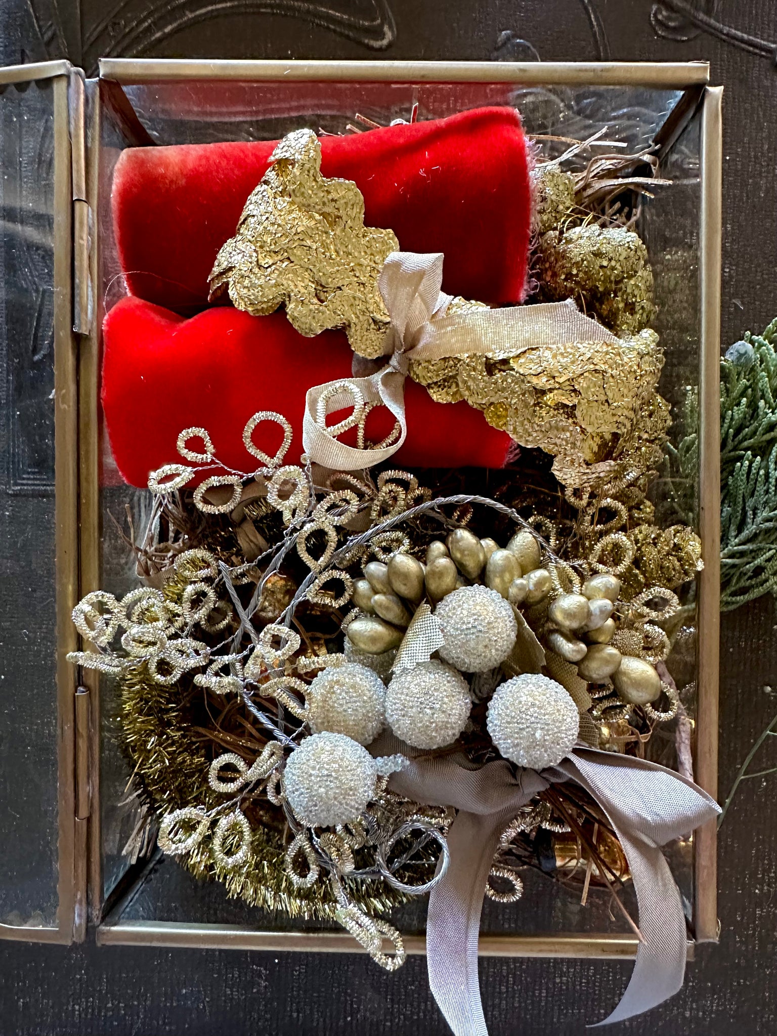 Beautiful scalloped, gold treasure boxes filled with some of my favorite things for the holidays