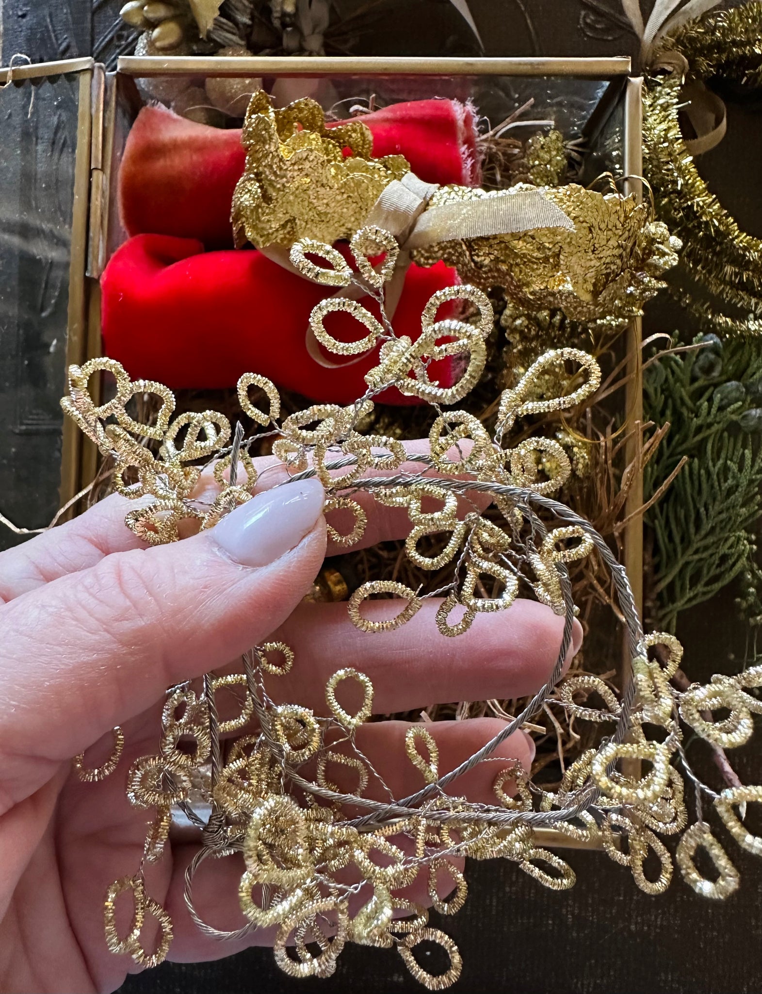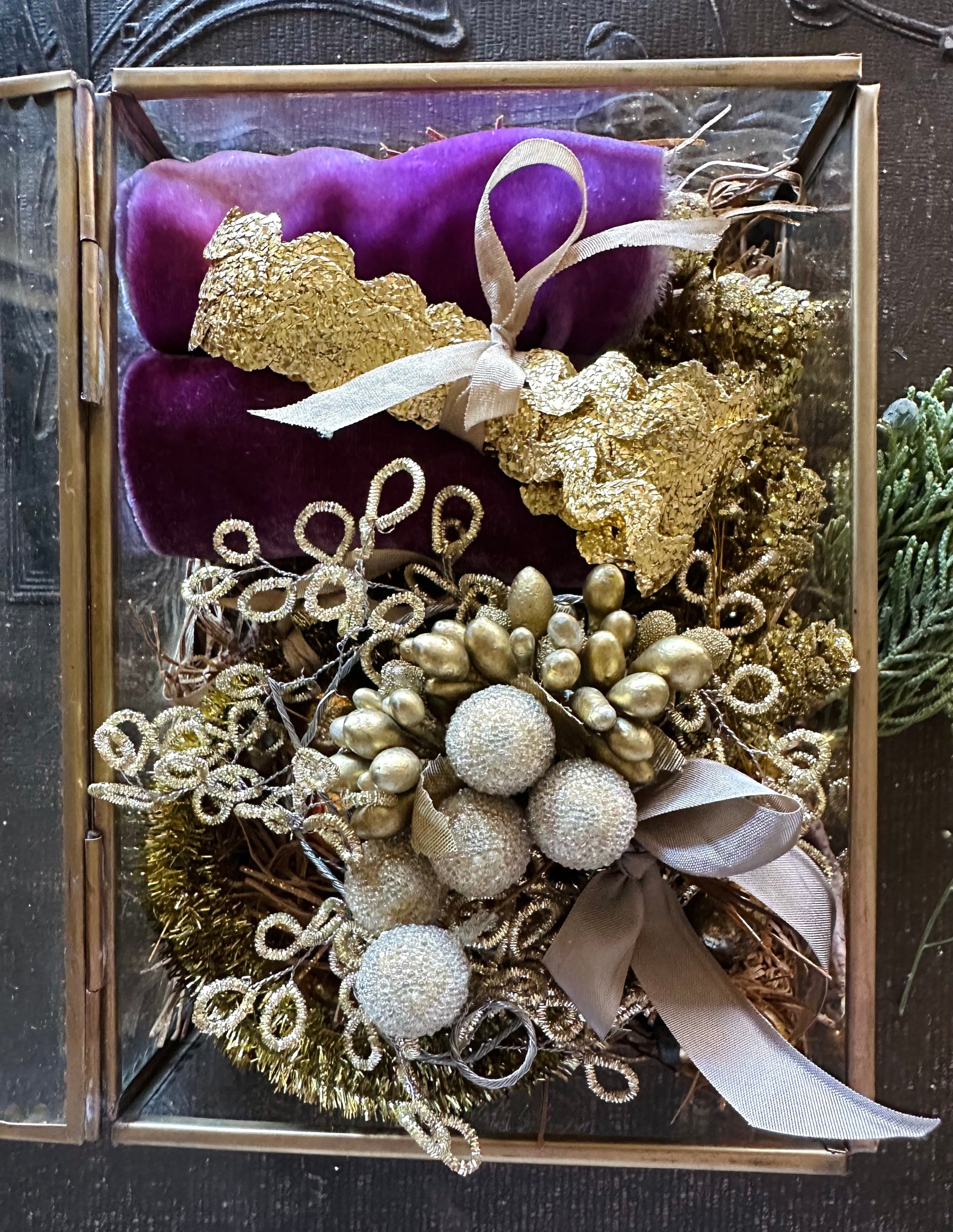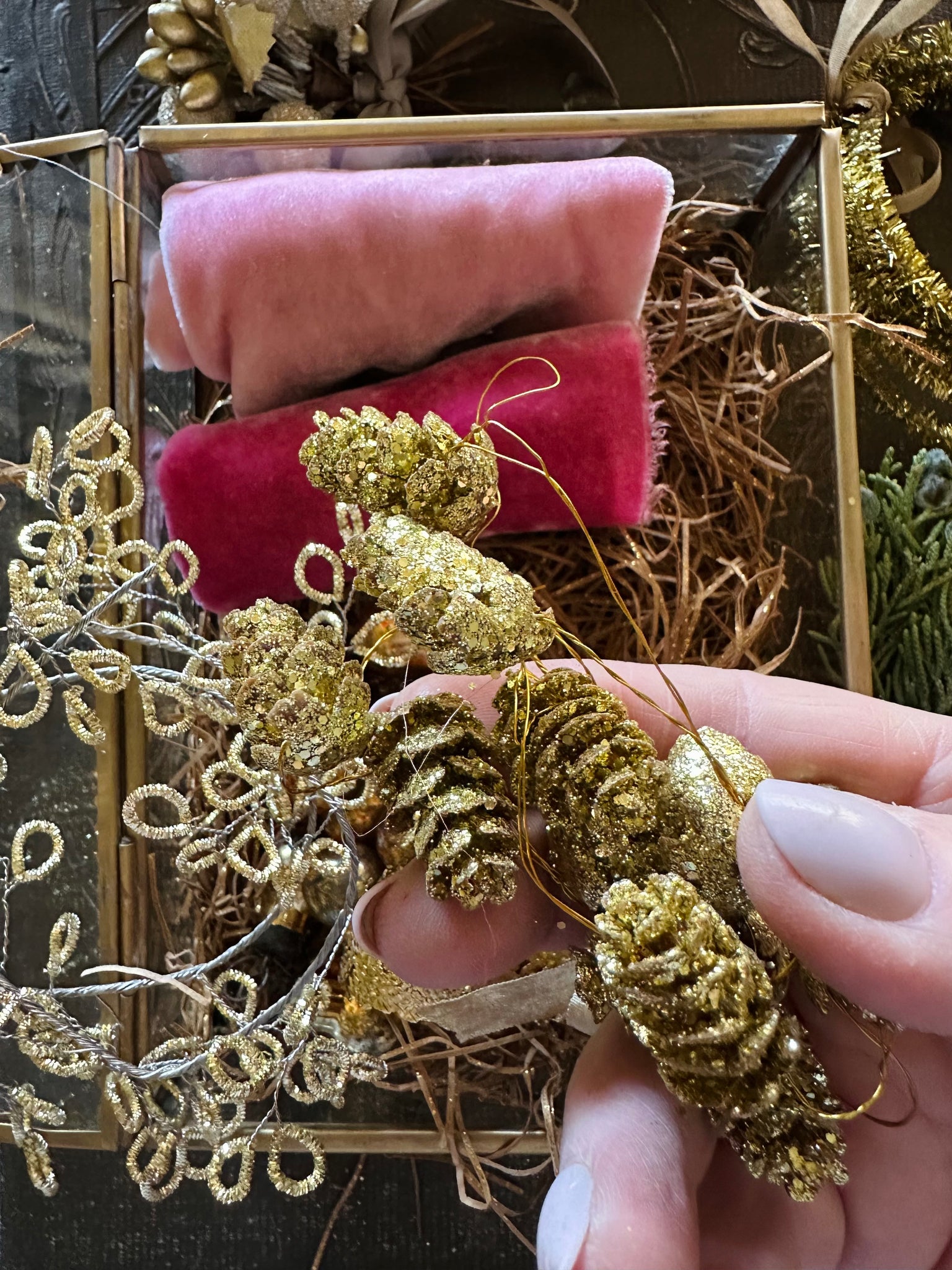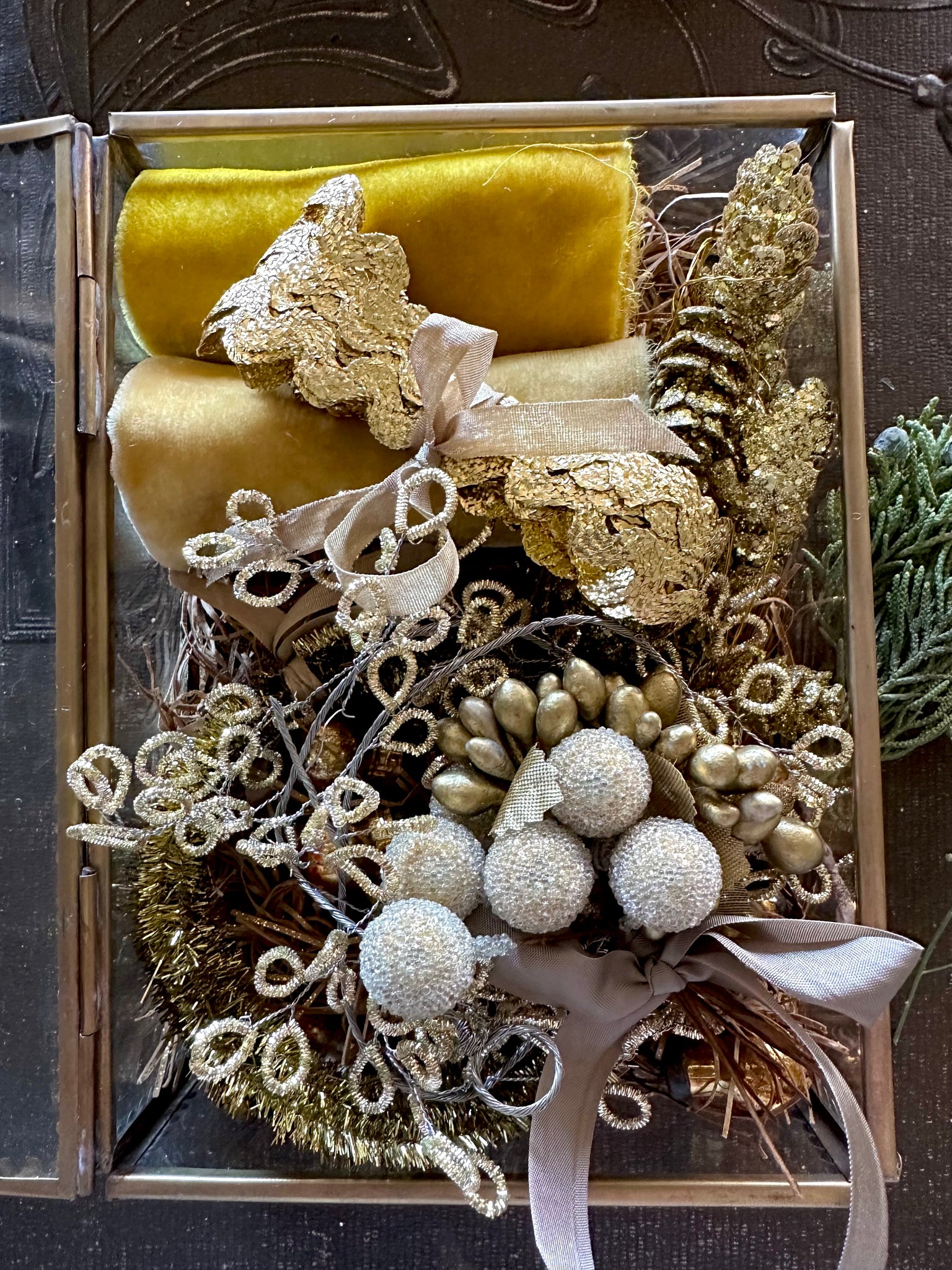 Two large ombre dyed silk velvet pieces approximately 10 x 7“, 12 golden mini ornaments, wired gold, tinsel, wired, gold bouillon leaves, champagne gold stamen bundle, 2 yards vintage gold metallic Ric rack, wired gold glitter pinecones