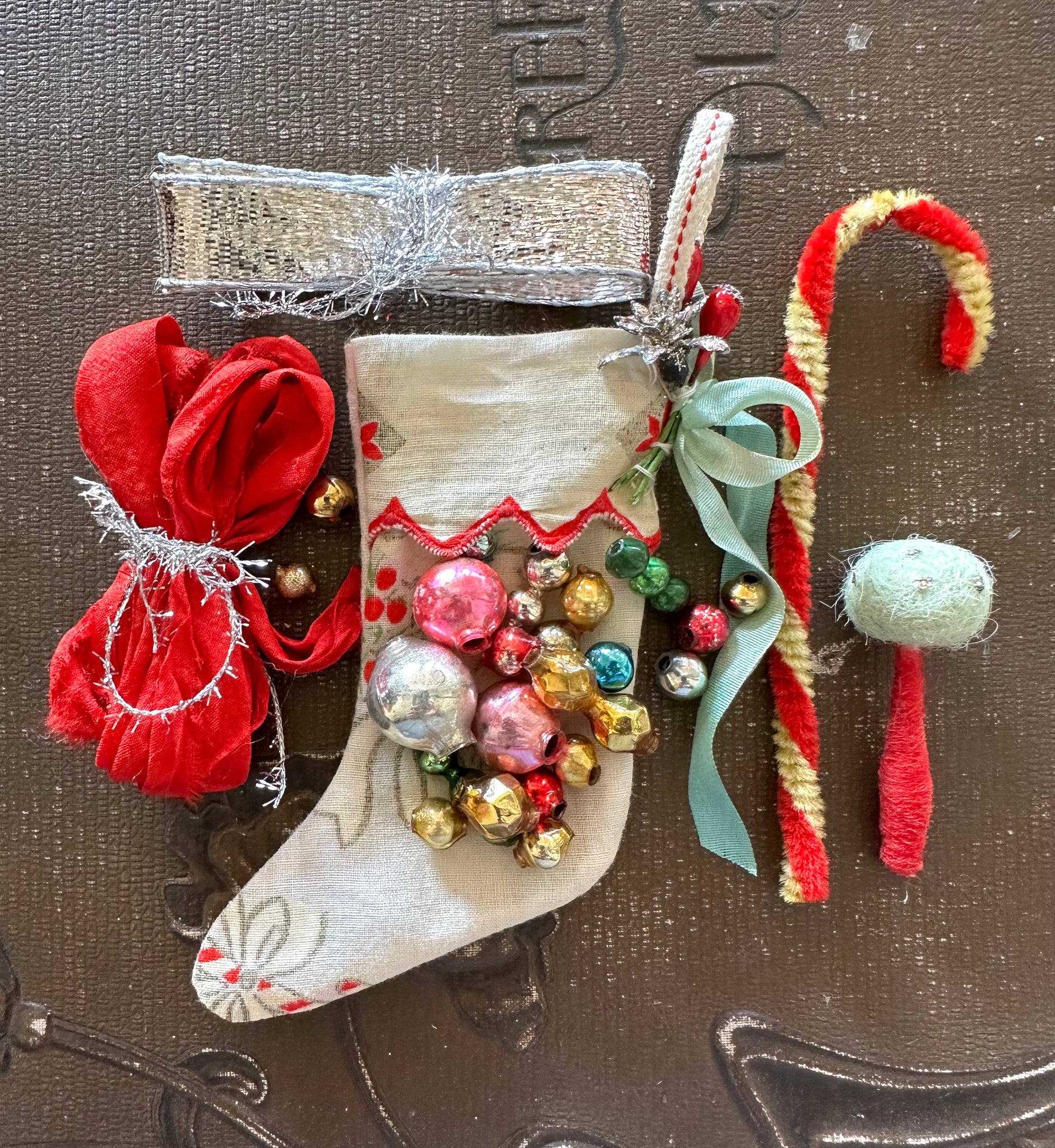 Tiny stockings are adorned with vintage millinery trims, hand dyed ribbons and are already filled with tiny treasures.