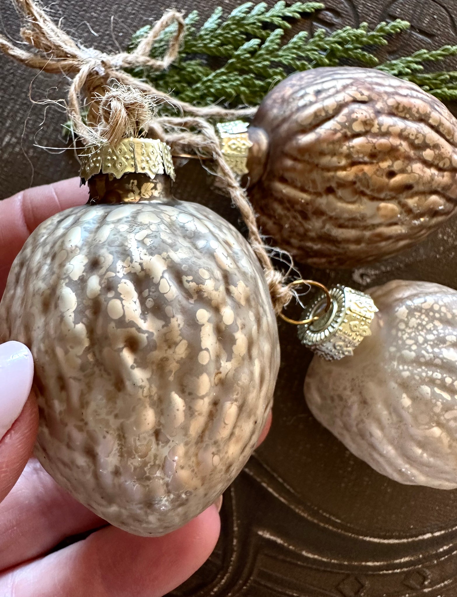Such a beautiful cluster of 3 glass walnut ornaments on jute hangers. These tiny glass walnuts are almost translucent. Three different colors are included in each bundle~ champagne, copper, and platinum. Each walnut measures approximately 3 inches tall including the hanging loop and 2 inches wide. These ornaments would look gorgeous tied to a small fresh wreath or tied along a garland. You can also easily cut them from their jute hangers for using individually.