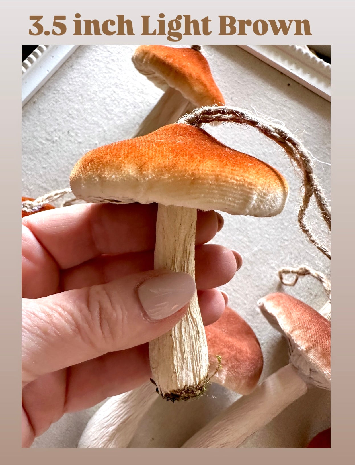 mushroom ornaments have a wrapped flocked velvet cap and a jute ornament string for hanging.