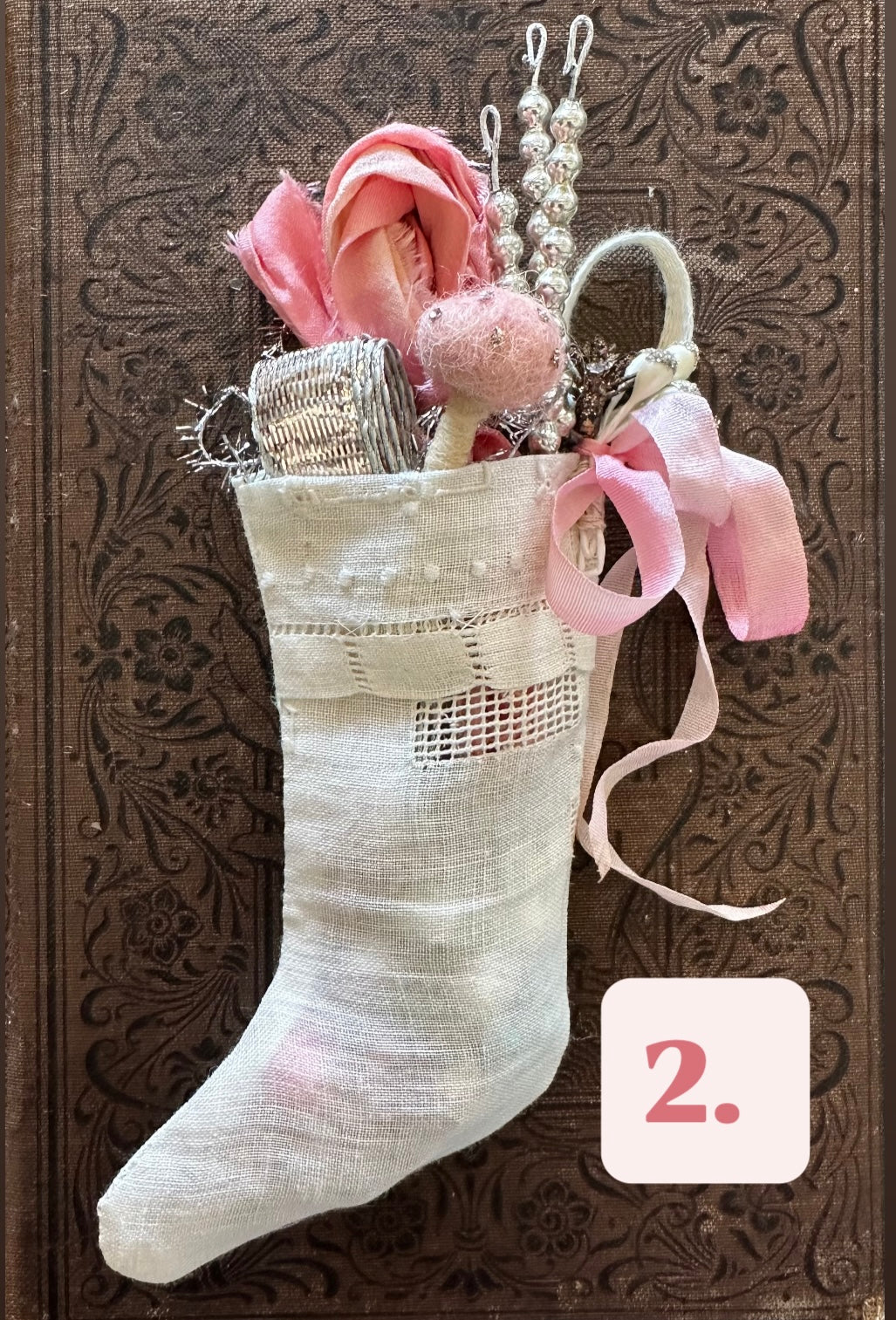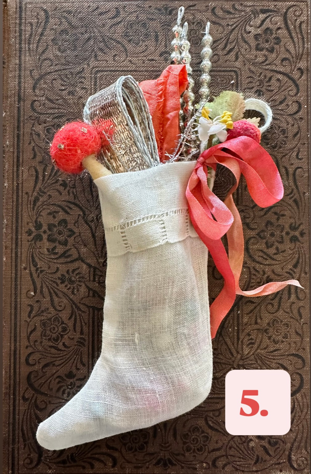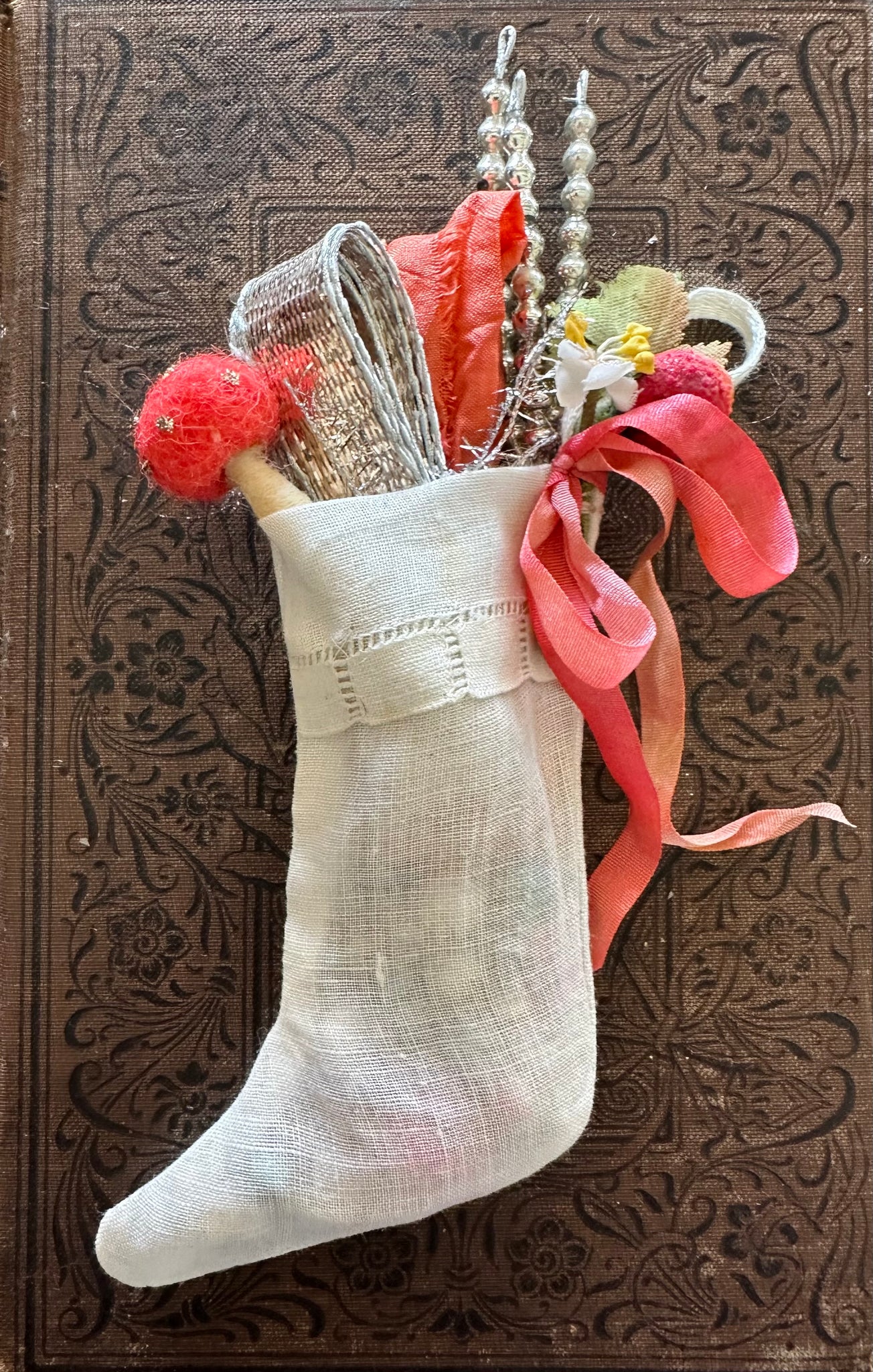 each stocking includes A bundle of ombre dyed ribbons, vintage metallic silver ribbon, a handmade wool mushroom, a silver mercury glass pick, and the toe is filled with tiny vintage mercury, glass garland beads