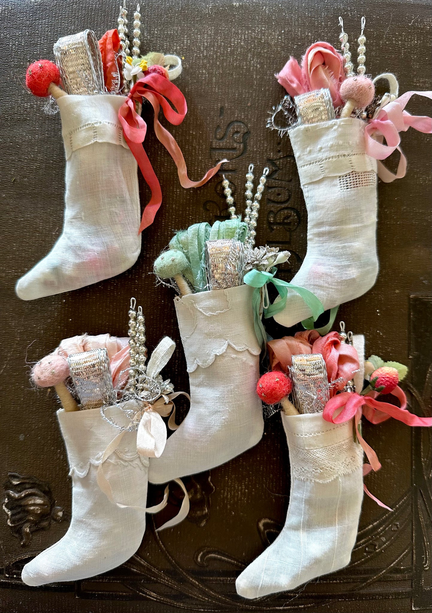Tiny stockings are adorned with vintage millinery trims, hand dyed ribbons and are already filled with tiny treasures.