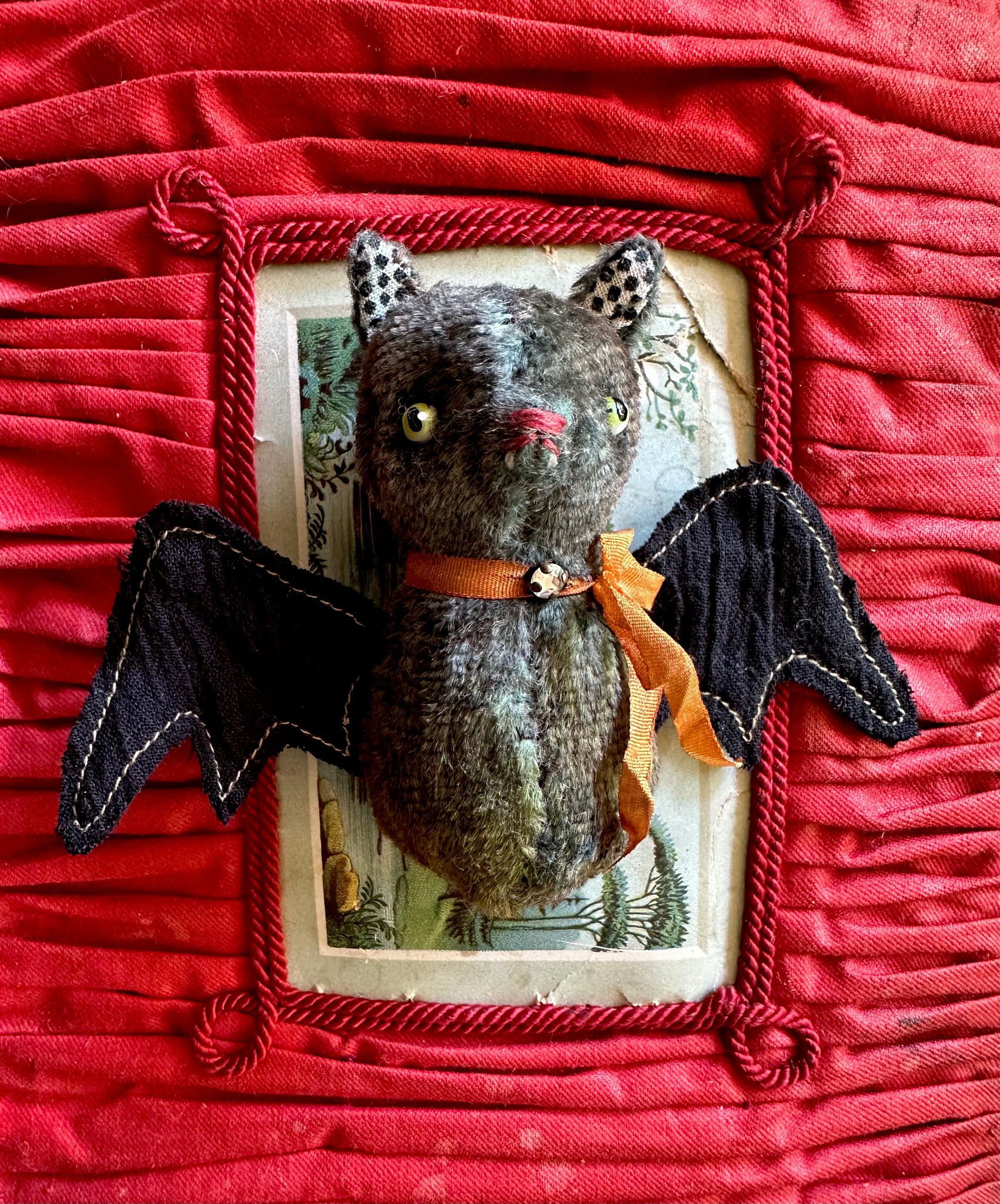 Tiny Fang is a little Drawlloween bat made with vintage fur with hand painted glass eyes and wired pose-able wings stitched from the old pirate pants from a little boy’s Halloween costume. Those cotton lined ears are from a vintage apron and an iridescent orange ribbon holds a magical rhinestone rose montee tied around his neck. Can you just barely see her baby teeth poking through? OOAK