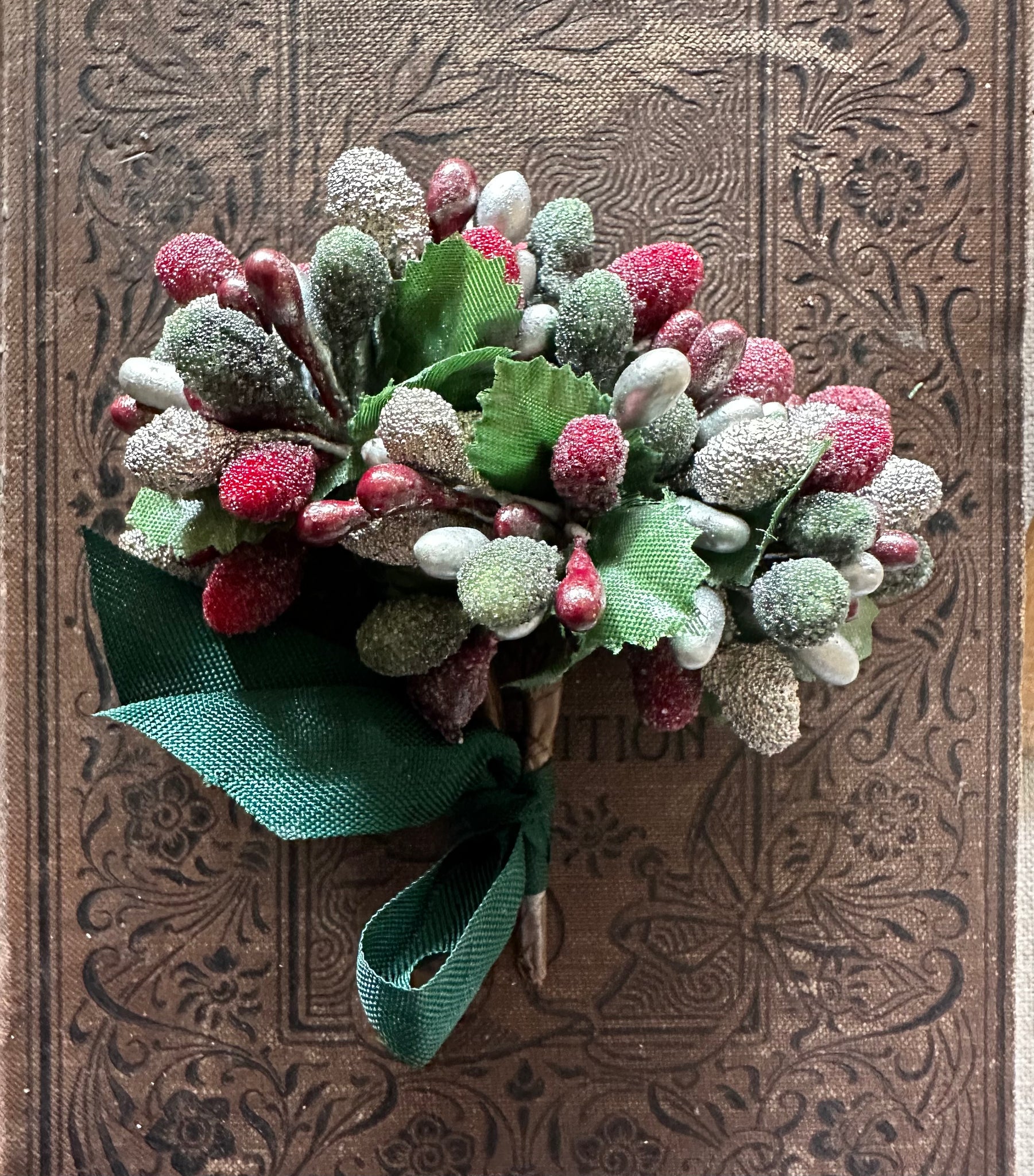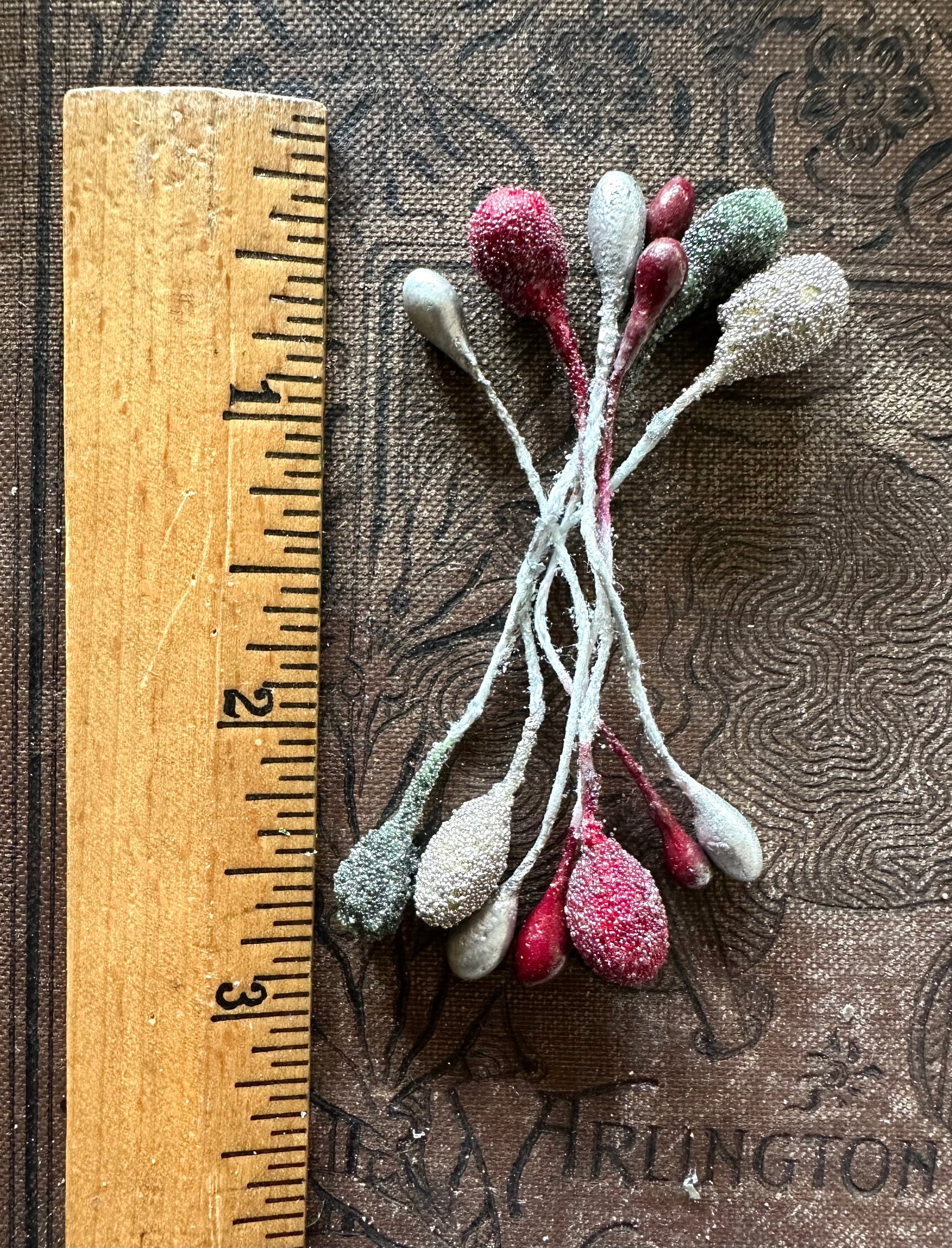 Gorgeous bundle of sugared and glossy metallic silver, green and red holiday stamens wrapped with a vintage ribbon.