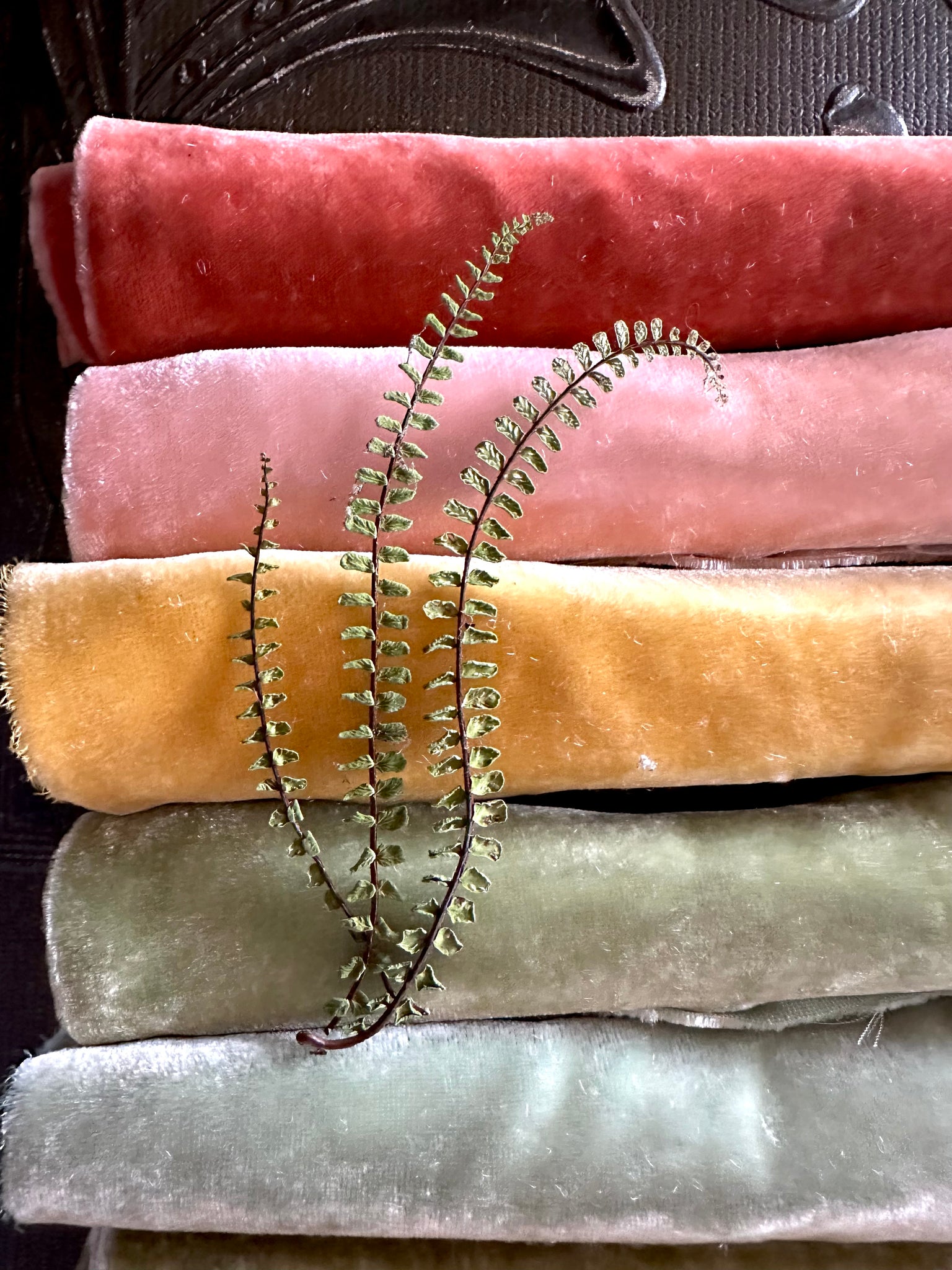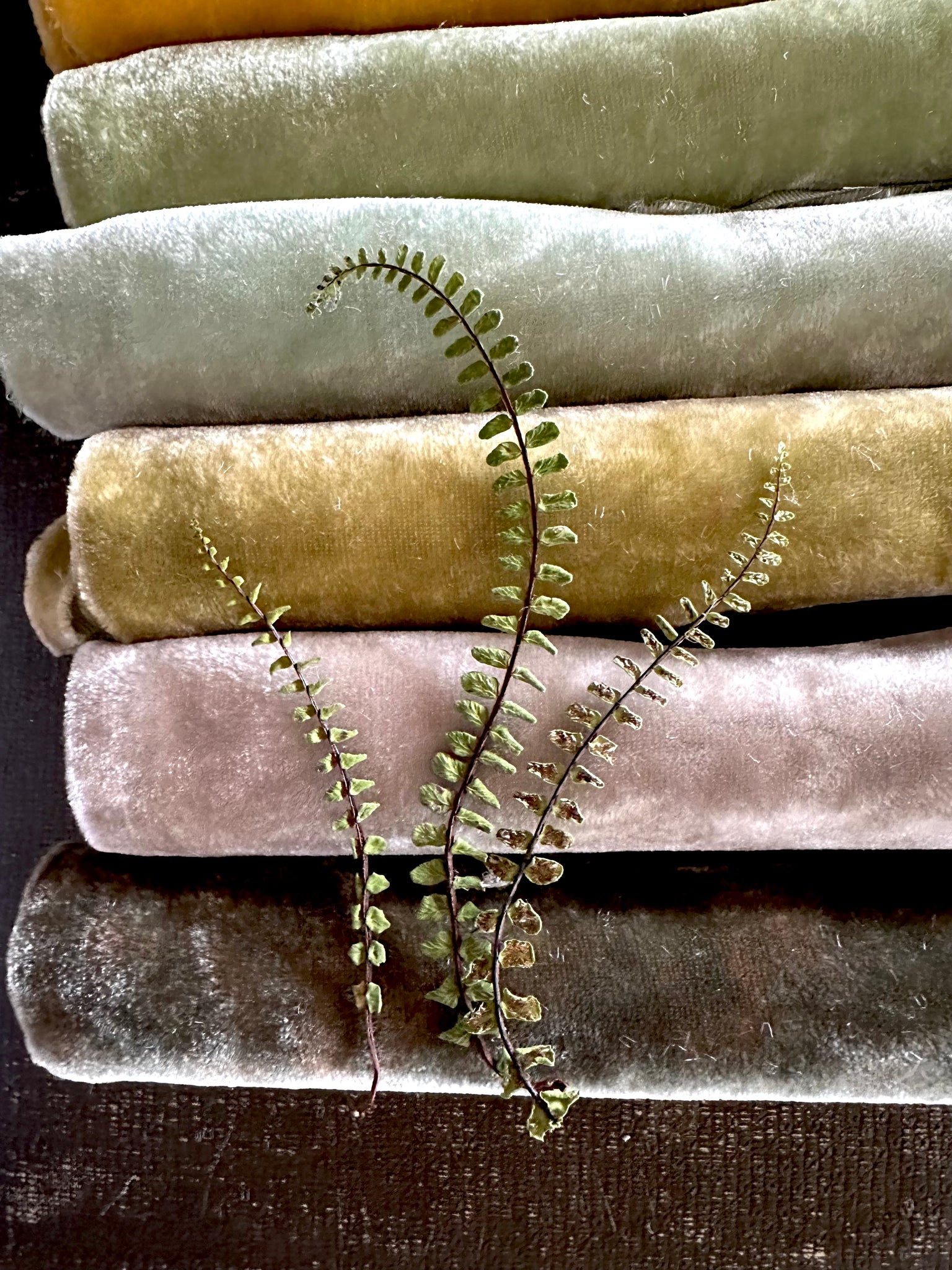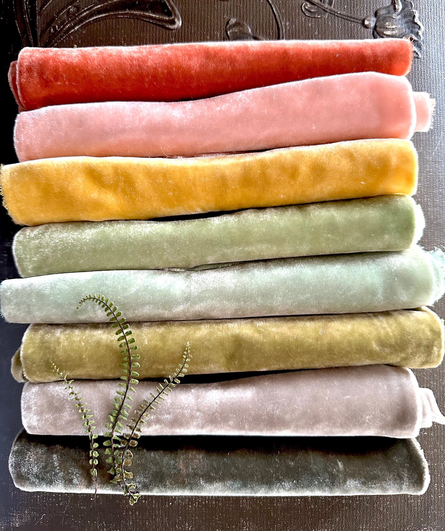Gorgeous hand dyed silk velvet pieces for your sewing projects. The SPRING BOTANICALS velvet collection was inspired by a magical rainy day trek through an Irish bog filled with old worn stones covered in lichens and grasses windswept by the ocean and a few scattered blossoms growing alongside the small pools of water in the peat.
