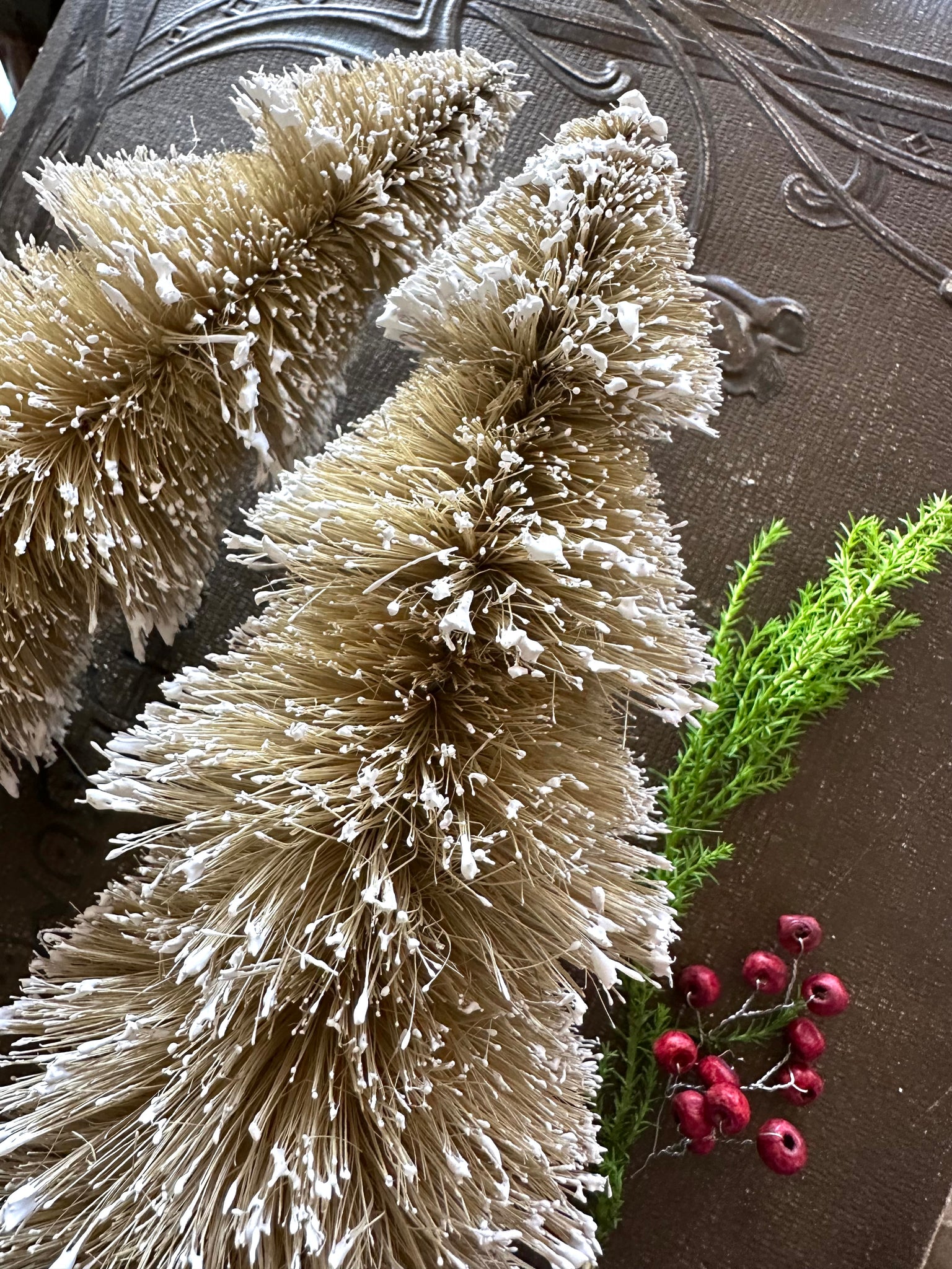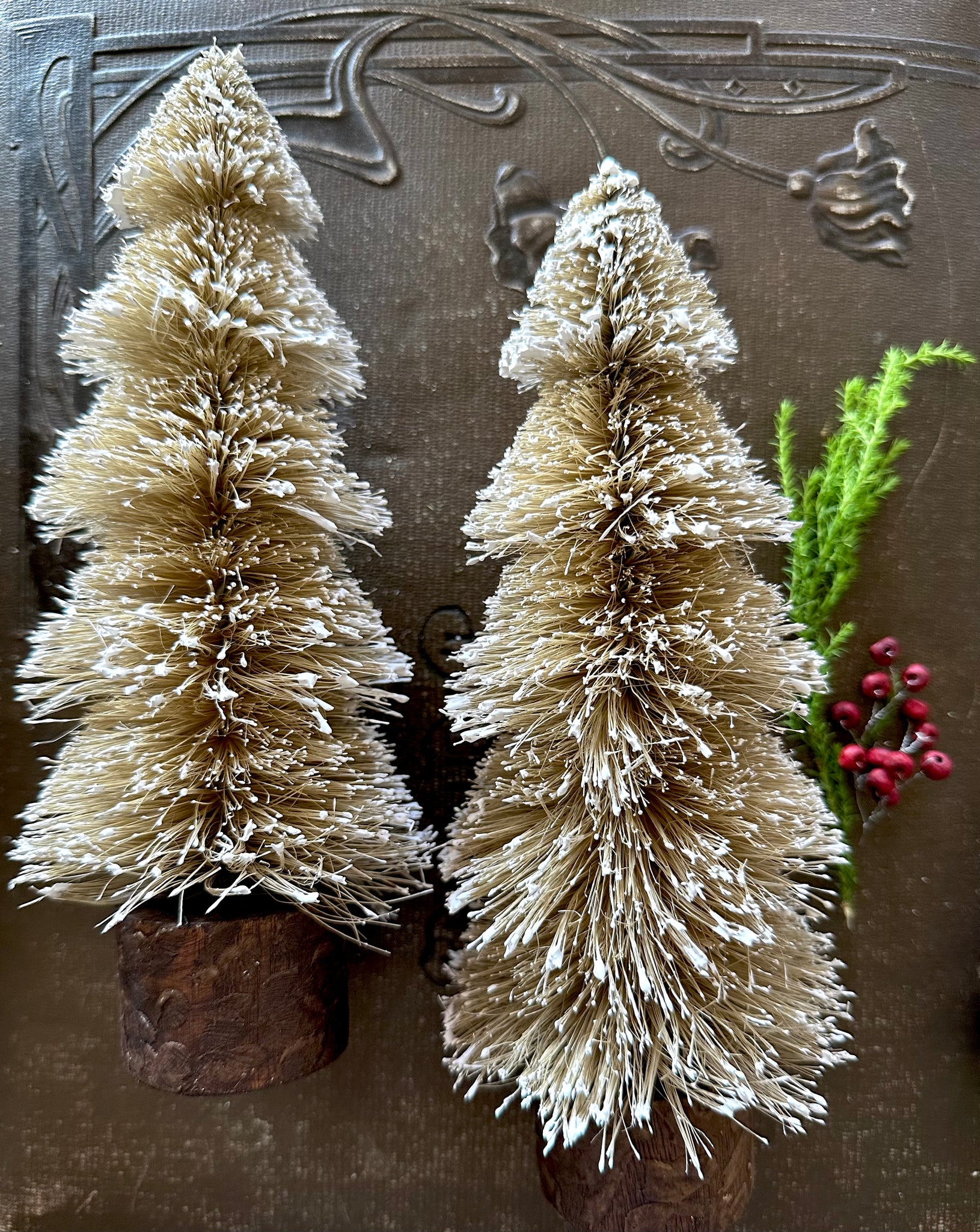 These dyed bottle brush trees have 5 stacked notched tiers and come in a beautiful natural color with a light flocking. Trees measure approximately 9 inches tall with a 2 inch diameter, wood base.