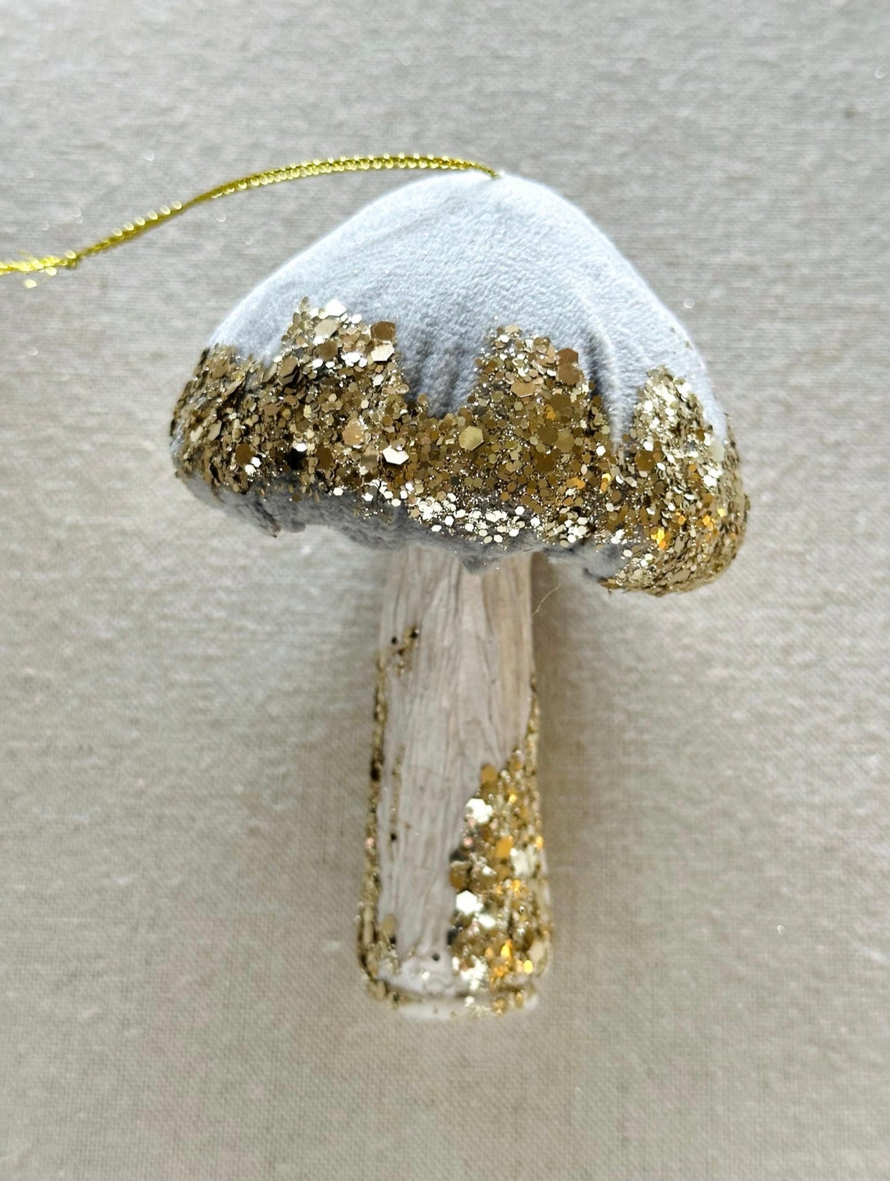 Mushroom ornaments have a wrapped pale sage green velvet cap and a gold ornament string for hanging.